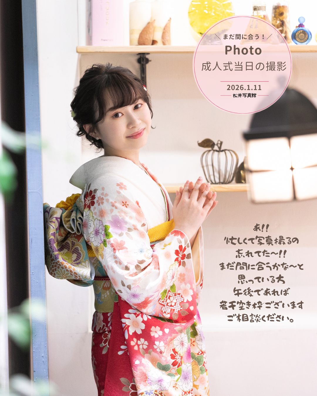 まだ間に合う当日の成人式撮影 2026.01.05 いよいよ成人式ですね。 あれ??忙しくて写真撮るの忘れてたよぉ~(´;ω;`)急遽でも写真撮影してもらえるの??まだ間に合うかなぁ~と思っているかた!!! 成人式当日午前中は満枠となっております(´;ω;`)が…午後であれば若干空き枠がございますのでご相談ください(^^)/もちろんゆっくり後撮りも出来ますよ☺ お問い合わせはお電話☎0278-22-2335または、HPお問い合わせホームより。 Share